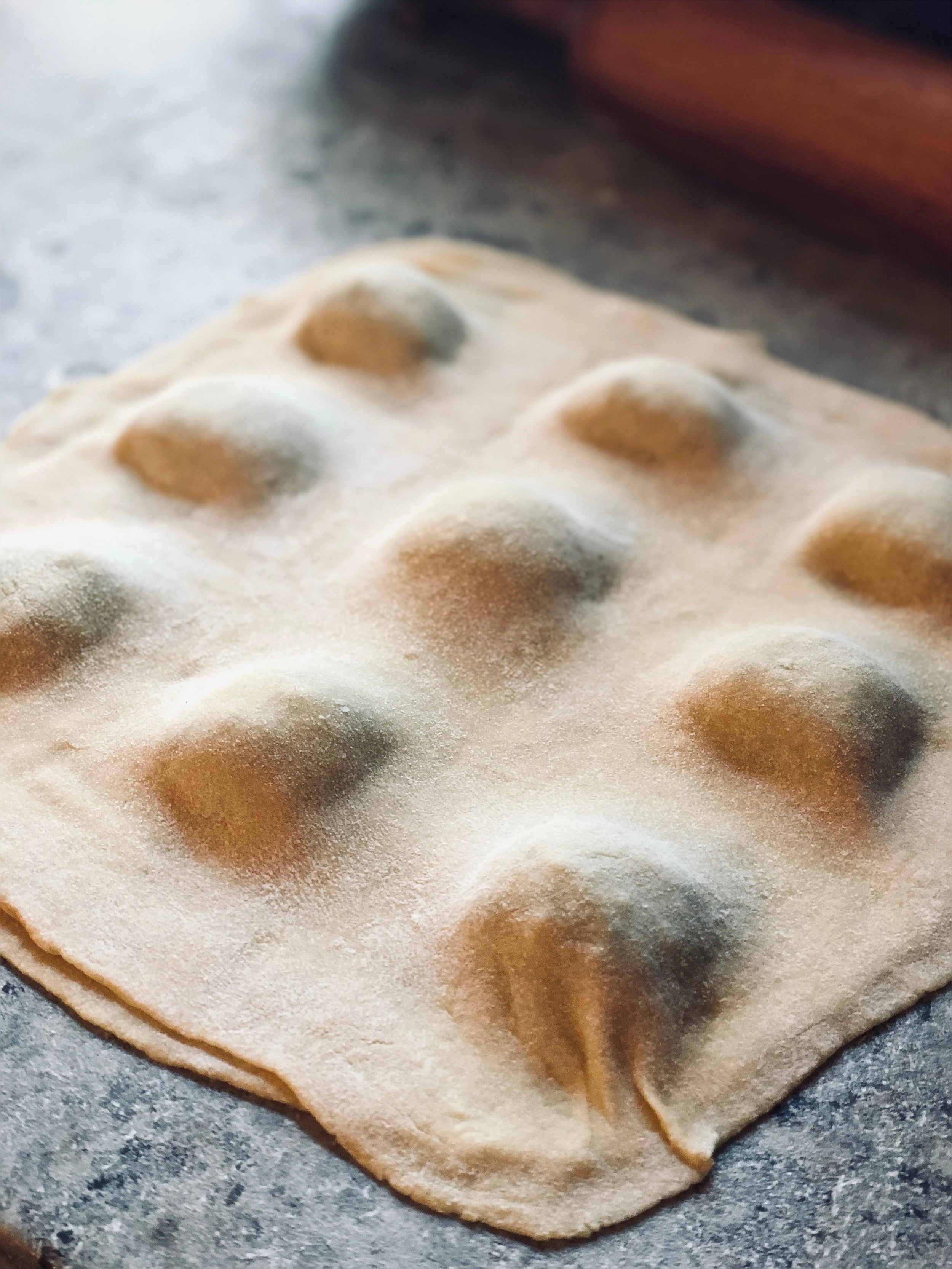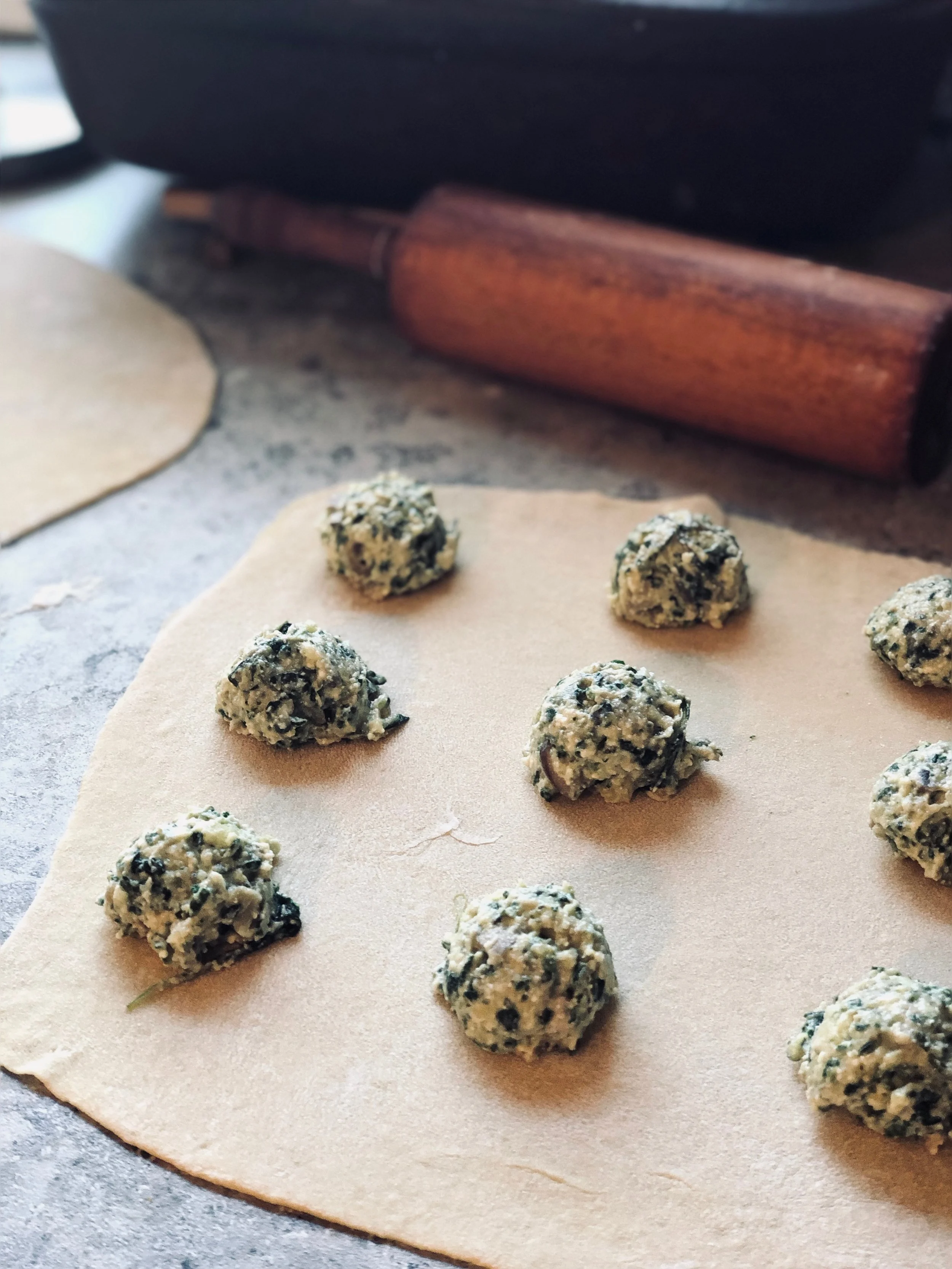 Begin to place dollops of filling (suggestions below) onto rolled out pasta, about 1 inch apart. I like to use a small cookie scoop to achieve equal amounts. But 1 tablespoon works just fine.